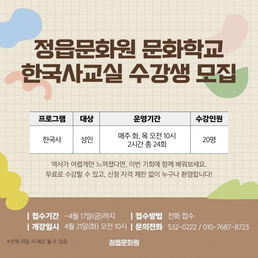 정읍문화원 2026 문화학교 한국사 교실 수강생을 모집합니다.